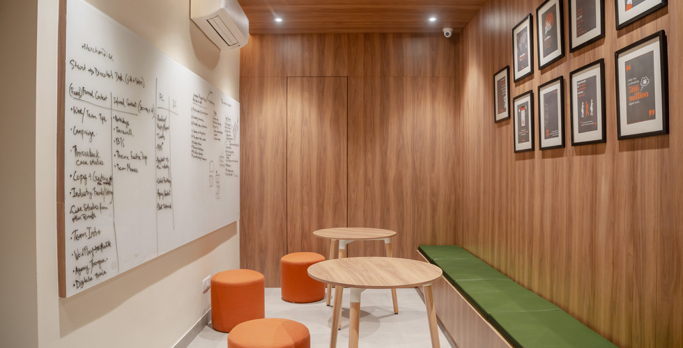 Housing a marketing agency and interior design studio for Komal Lunia Design Studio under one roof, the office consists of an open layout with several formal and informal spaces such as a brainstorming area, lunch zone that doubles up as an interaction space, conference room, kids room, and staff and CEO cabins. The co-existence of the two was achieved by demarcating the floor plan of 2500 sq. ft. into 2 halves and connecting it through a common passage.