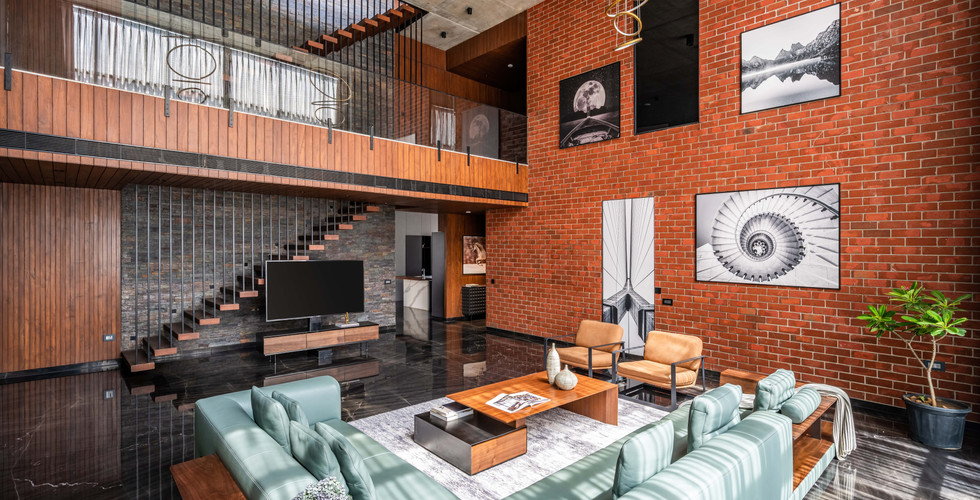 With a combination of exposed brick and exposed RCC along with large-sized glass windows, we have channelized our efforts into making the main compositional structure of the house and created a multilevel altitude. The blocks have varying heights according to the function. The welcoming zone is the double-height living space, with bedrooms on the middle floor and the service zone being the lowest, thus making the whole structure three-storeyed.
