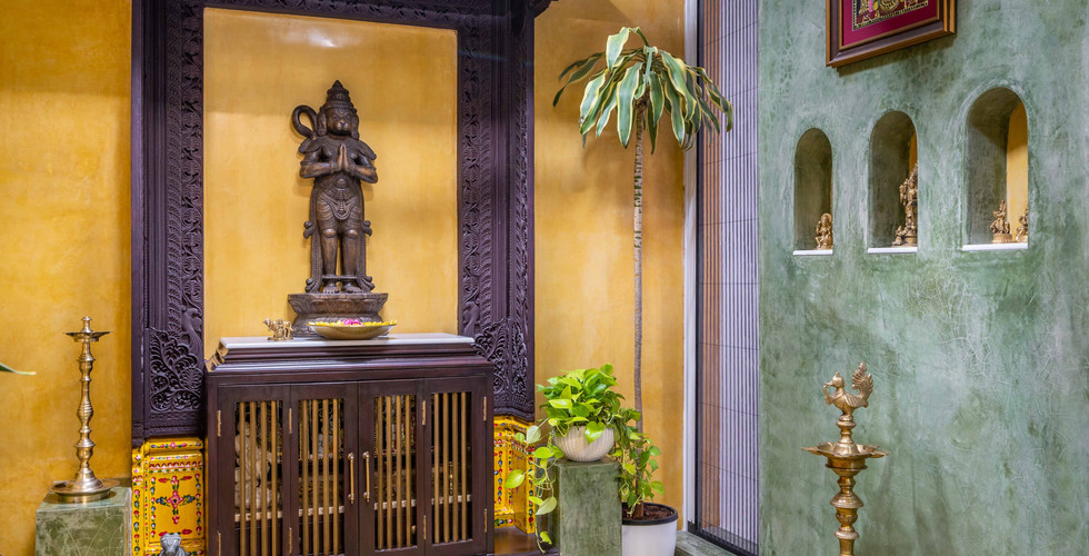 Entrance to flat is from north east corner where puja court is placed which connects to rest of the flat. The puja room has been designed with special care with wooden carving 'Mantap' while having pleasant green and bright yellow oxide finished walls giving temple ambience. The yellow oxide flooring laced with round marbles and copper flowering which also extends onto foyer is the highlight and looks very rich and pleasant experience to walk on.