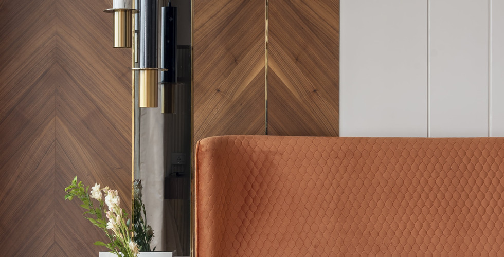 The son's bedroom showcases a diagonal veneer and a Deco back panel, accompanied by a bright contrasting bed. The L-shape wardrobe finished in a muted tone and mirror creates an expansive feeling, while the wooden study table ahead of the fluted back panel adds a sense of warmth to the space.