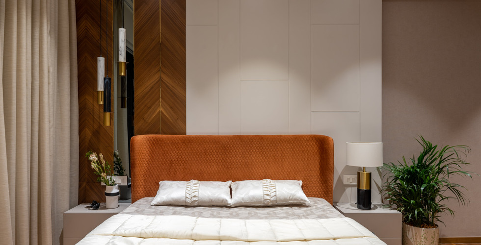 The master bedroom sets a mature ambiance with its subdued colour palette and wooden accents. A custom-made spacious wardrobe with round golden handles, a plush headboard, subtle green touches paired with gold walls bathed in soft lighting combine to evoke an elegant chic vibe.