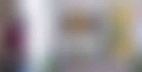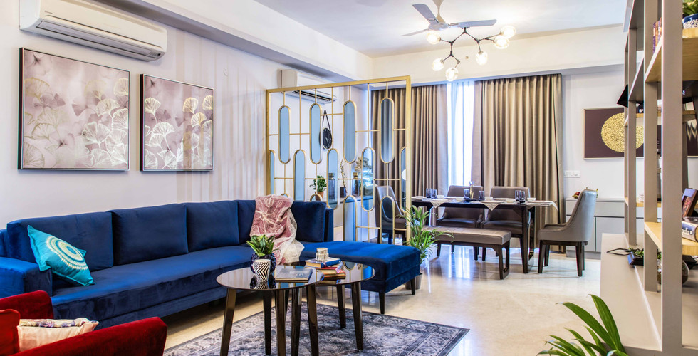 The entrance lobby gives the view of the entire living and dining space backed with a gigantic window-door that provides a panoramic view of the nature surrounding the building. The walls are light-grey coloured and give the sense of a larger space, however the blue and pink sofas break the monotony and brighten up the space. Geometric partition in golden metal with tinted blue glass gives dining its own space while adding a natural blue tint in the living room.