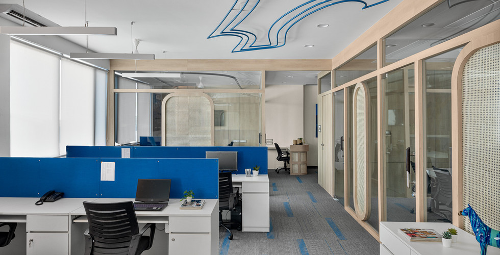 Step into this exquisitely designed workspace, where innovation meets elegance. A glass partition, artfully adorned with cane sheets, strikes a balance between privacy and natural light, while the standout feature is a striking 30-foot-long rope structure suspended from the ceiling, printed on flex material in a captivating shade of blue. This artistic installation serves as both a creative statement and a visual focal point.