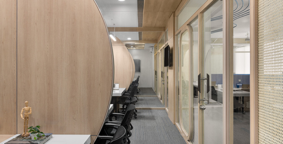 The office's timeless white palette is subtly accented with shades of blue found in the softboards, carpets, and decor elements. The meeting room’s geometric design symbolizes the company’s dedication to simplicity and efficiency. Within the cabins, white glass tables and walls double as functional writing surfaces, enhanced by sophisticated fluted panels.